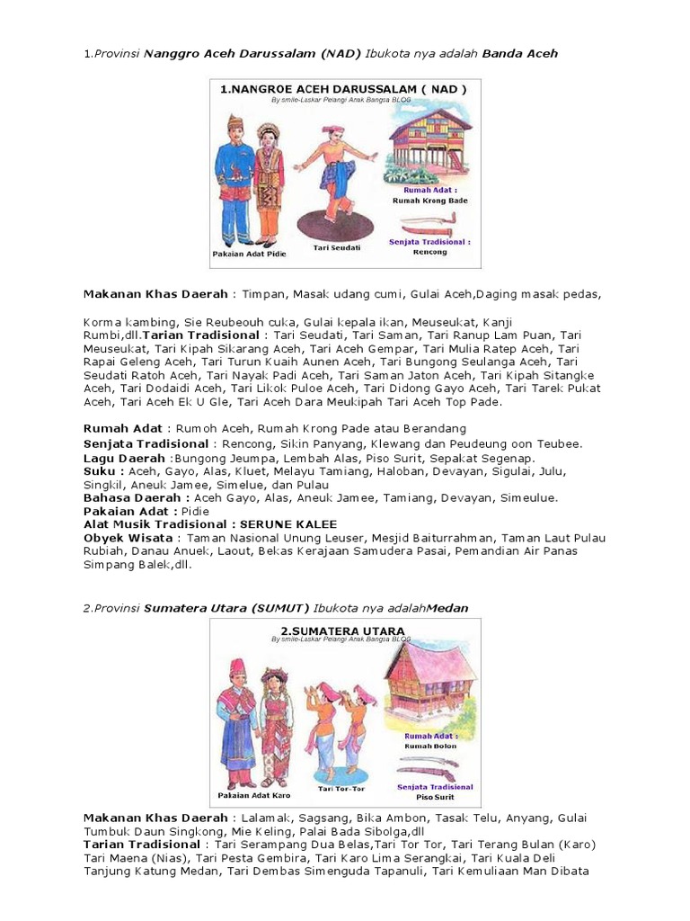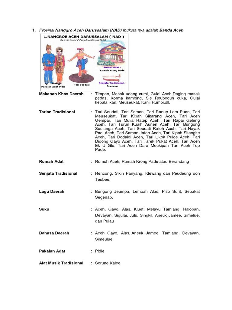 1.provinsi nanggro aceh darussalam (nad) ibukota nya adalah banda aceh. Banyak anak zaman sekarang yang sudah langka tertarik untuk mempelajari kebudayaan yang ada di negaranya sendiri. Rumoh aceh, rumah krong pade atau berandang.