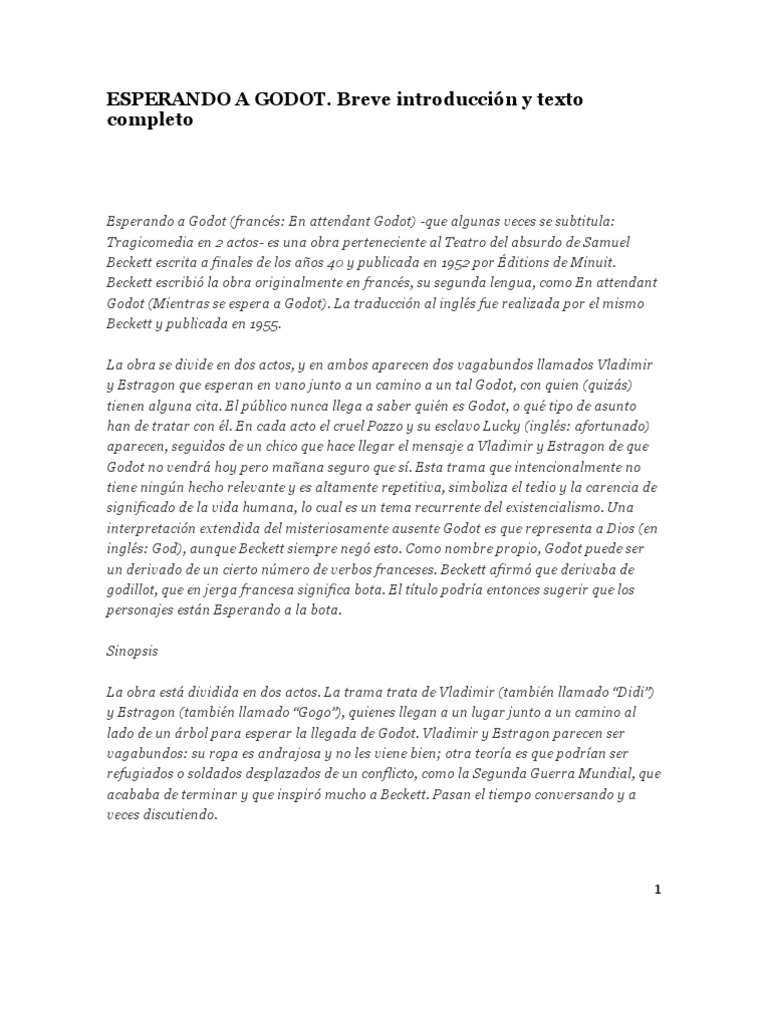 Bijhtcctú samuel beckett btildeav samuel beckett en fábula esperando godot traducción de ana moix 26. Cuando en 1953 se estrenó en parís esperando a godot, casi nadie sabía quien era samuel beckett, salvo, quizá, los que ya lo conocían como exsecretario de otro irlandés, no menos genial, james joyce. Resumen y sinópsis de esperando a godot de samuel beckett. Pero viadimiro y estragón no están solos.