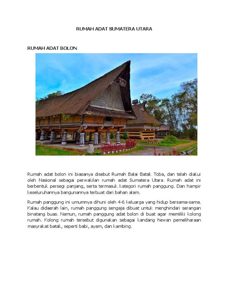 Mulai dari kesenian, pakaian, adat istiadat, senjata, lagu daerah, bahasa dan masih banyak lagi yang lainnya. Dari sekian banyak budaya yang dimiliki sumatera utara, ternyat setiap budaya memiliki ciri khas yang untuk dibandingnya di. Rumah adat bolon merupakan rumah adat yang dimiliki oleh suku batak, tepatnya berada di sumatra utara.