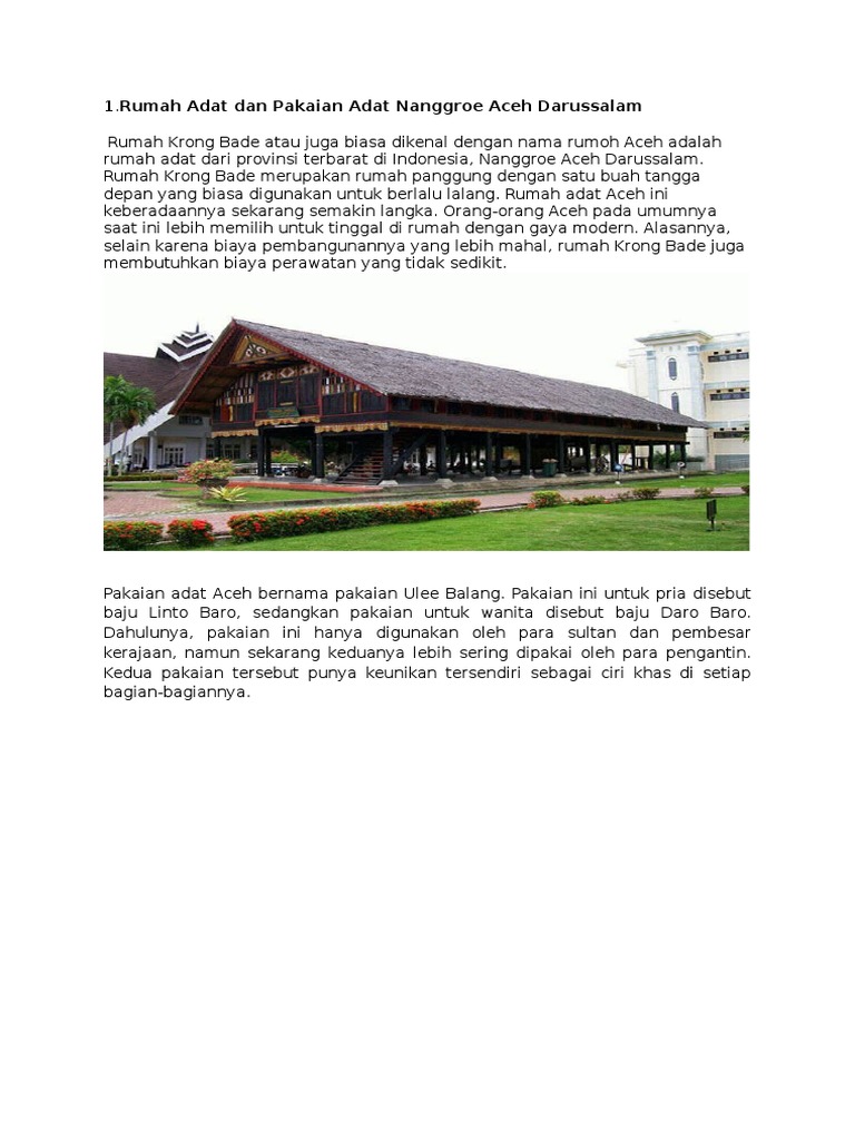 Rumah adat aceh ini keberadaannya sekarang semakin langka. Rumah adat dan asalnya provinsi nanggroe aceh darussalam | rumah krong bade. 34 nama pakaian adat tarian adat rumah adat dan senjata.