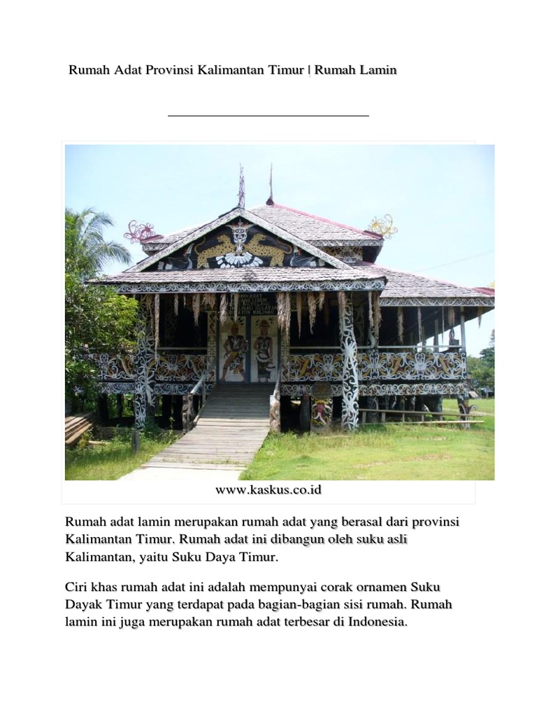 Rumah adat kalimantan timur / kalimantan timur merupakan salah satu provinsi di indonesia yang masyarakatnya dikenal memiliki budaya yang cukup unik. Rumah lamin adalah rumah adat kalimantan timur. Rumah lamini ini memiliki arti rumah panjang kita semua yang digunakan oleh beberapa keluarga yang tergabung menjadi satu keluarga besar. Rumah adat ini biasanya dibangun menghadap ke arah sungai.